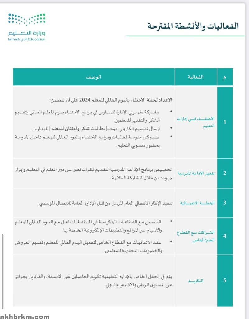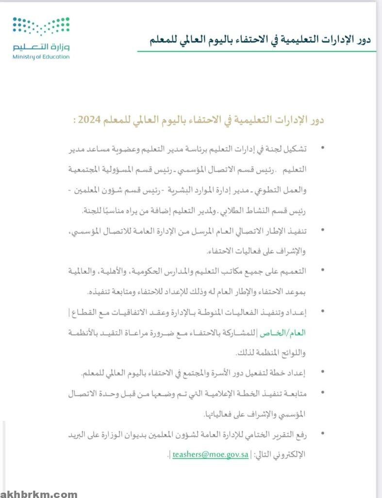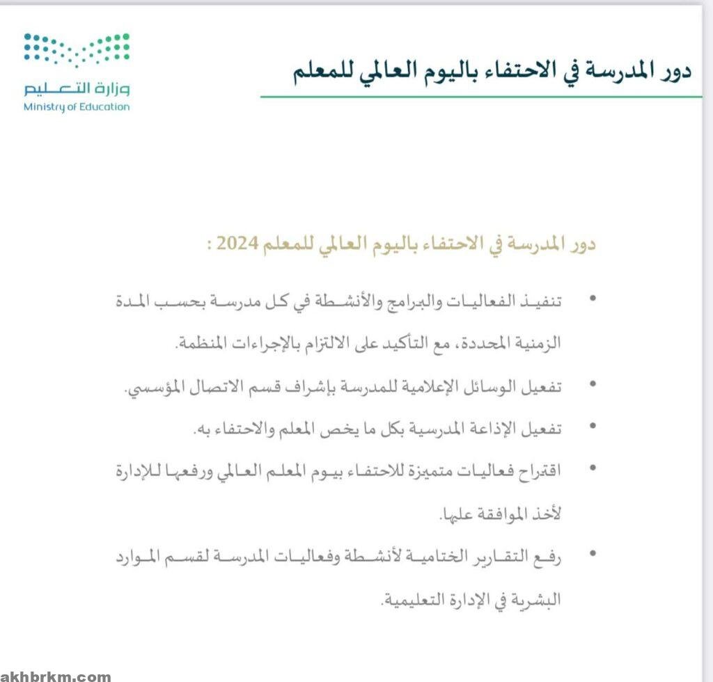 ويتم تنفيذ برامج الاحتفاء باليوم العالمي للمعلم 2024 في الإدارات التعليمية والمدارس من يوم الأحد 6أكتوبر 2024 إلى يوم الخميس 10 أكتوبر 2024