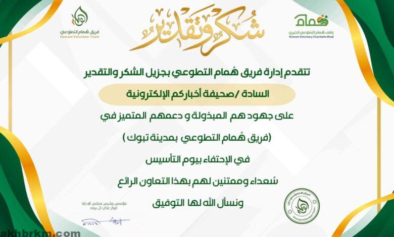 كرم فريق همام التطوعي ممثلًا بمؤسسة ورئيسة مجلس الإدارة الدكتوره أنوار علي آل برمه صحيفة “أخباركم” الإعلامية تقديرًا لجهودها الإعلامية ودعمها المتميز للفريق وذلك خلال احتفالية يوم التأسيس بمدينة تبوك.