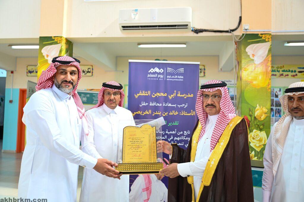 شارك محافظ حقل خالد بن بندر الخريصي اليوم، في الاحتفاء الذي نظمه مكتب تعليم حقل بمناسبة اليوم العالمي للمعلم, وذلك بمدرسة أبي محجن الثقفي الابتدائية.