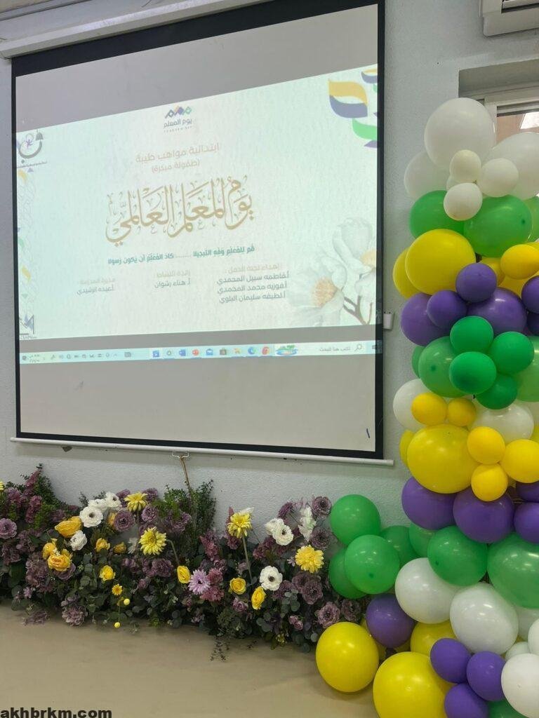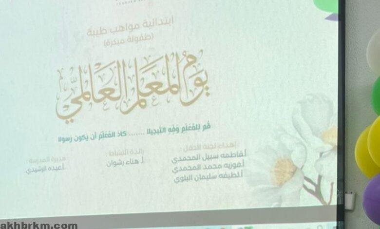 ابتدائية مواهب طيبة للطفولة المبكرة بالمدينة المنورة بيوم المعلم الذي يصادف الخامس من أكتوبر من كل عام ميلادي، وذلك احتراماً وتقديرا للعطاء المبذول في إنجاح المسيرة التعليمه عبر فعالية مصغرة بحضور طالبات المدرسة والمعلمات المحتفى بهم ،