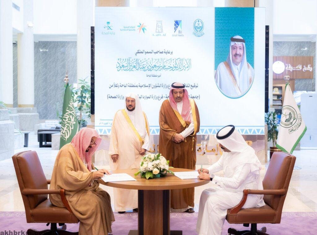 شهد صاحب السمو الملكي الأمير الدكتور حسام بن سعود بن عبدالعزيز، أمير منطقة الباحة ، في بديوان الإمارة اليوم ، وبحضور معالي وزير الشؤون الإسلامية والدعوة والإرشاد الشيخ الدكتور عبد اللطيف بن عبدالعزيز آل الشيخ، توقيع عدداً من اتفاقيات التعاون بين وزارة الشؤون الإسلامية والدعوة والإرشاد ممثله بفرعها بمنطقة الباحة مع كلاً من جامعة الباحة، وأمانة الباحة، وفرع وزارة الموارد البشرية، وفرع وزارة الصحة .