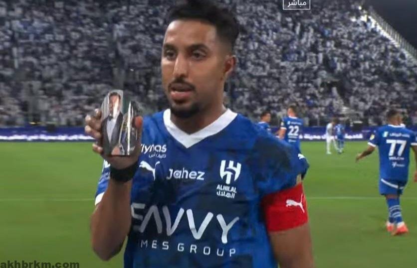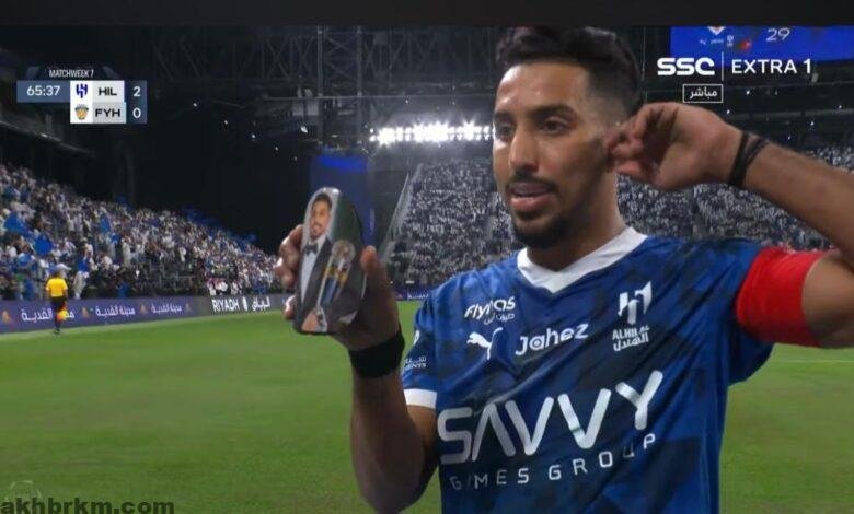 اللاعب سالم الدوسري كبتن المنتخب السعودي وكابتن فريق كرة القدم نادي الهلال السعودي بعد تسجيله هدف في مباراه مع فريق كرة القدم لنادي الفيحاء