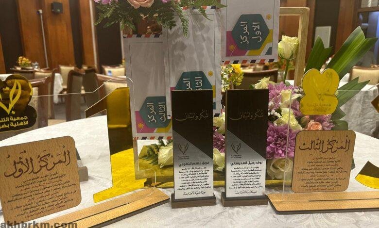 وفي ختام الحفل تم اعلان المراكز الفائزة وحصل على المركز الأول فريق مُلهم التطوعي التابع لجمعية التنمية الاهلية وحقق المركز الثاني فريق إيثار التطوعي التابع لجمعية الدعوة والإرشاد والمركز الثالث لفريق جمعية نوى التطوعي التابع لجمعية نوى للخدمات الصحية، وتم تكريم المتطوعين والمتطوعات والمشاركين من المصورين المتميزين والرعاة والداعمين للبرنامج.