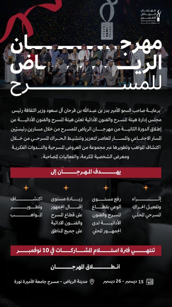 أعلنت هيئة المسرح والفنون الأدائية عن إطلاق الدورة الثانية من مهرجان الرياض للمسرح برعاية الأمير بدر بن عبدالله بن فرحان وزير الثقافة رئيس مجلس إدارة هيئة المسرح والفنون الأدائية، خلال الفترة ما بين 15 إلى 26 ديسمبر 2024.