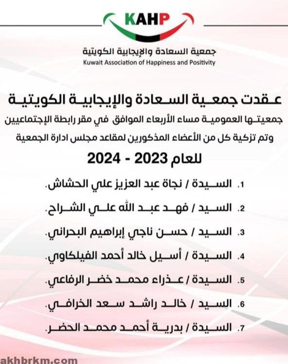 تبارك صحيفة اخباركم الاعلاميه لسعادة السيدة نجاة عبدالعزيز علي الحشاش انتخابها لرئاسة مجلس ادارة جمعية السعادة والإيجابية الكويتية
