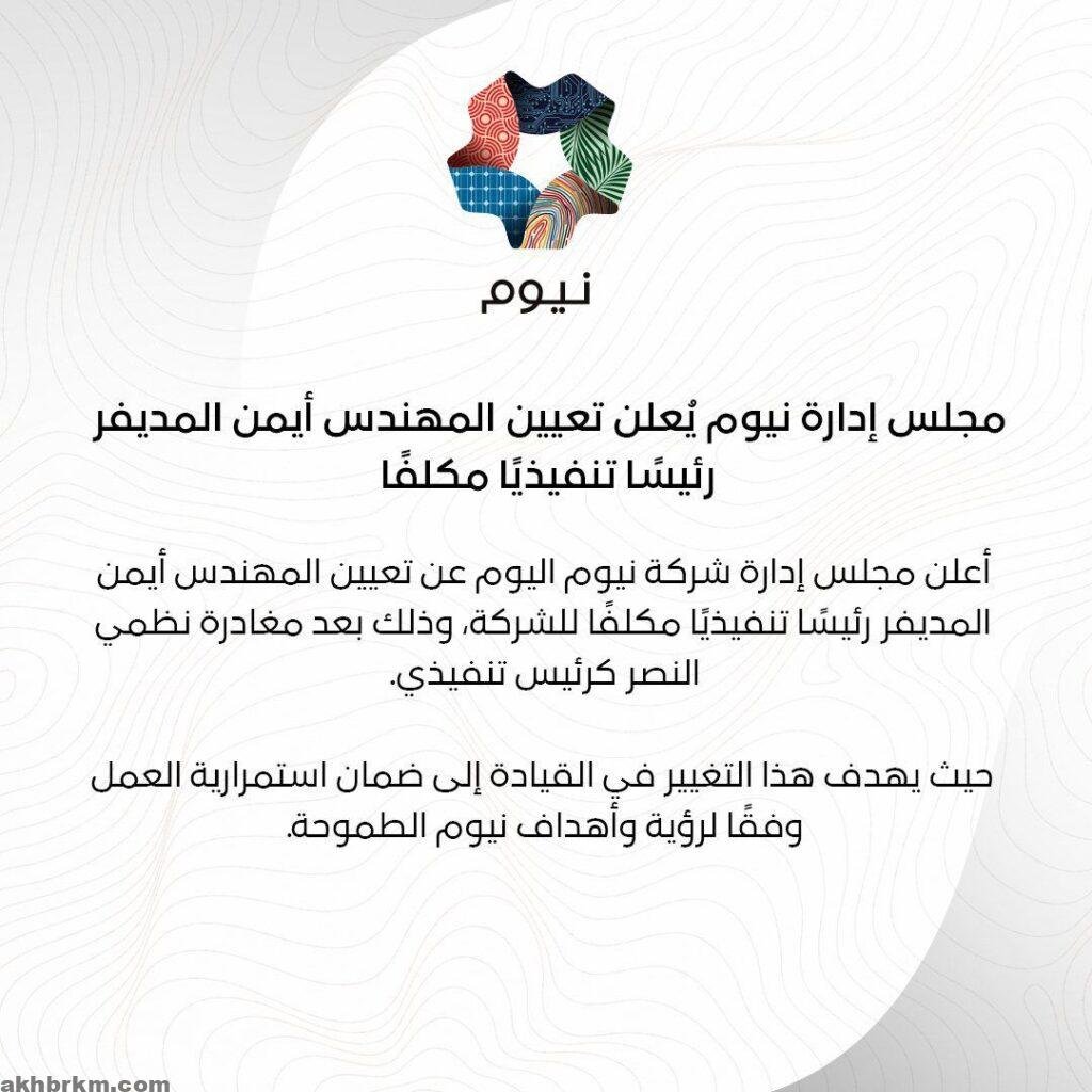 أعلن مجلس إدارة شركة نيوم اليوم عن تعيين المهندس أيمن المديفر رئيسًا تنفيذيًا مكلفًا للشركة، وذلك بعد مغادرة نظمي النصر كرئيس تنفيذي. حيث يهدف هذا التغيير في القيادة إلى ضمان استمرارية العمل وفقًا لرؤية وأهداف نيوم الطموحة.