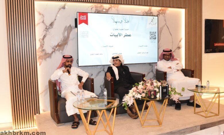 أقيمة مساء يوم الثلاثاء أمسية شعرية بعنوان عطر الأبيات وسط حضور رائع للجنسين من متذوقي الشعر الشاعران عوض الفاضلي والشاعر سالم حمود البلوي حيث قدم مقدم الأمسية الاستاذ: فهد العطوي بالترحيب بالشعراء وبالحضور وبتقديم مختصر للسيرة الذاتية للشاعرين وحياتهم مع الشعر ومتى اكتشف الشاعر نفسه والتأثير البيئي والاجتماعي المباشر الذي أوصل كل منهم إلى ما وصل اليه ليكون شاعرا.