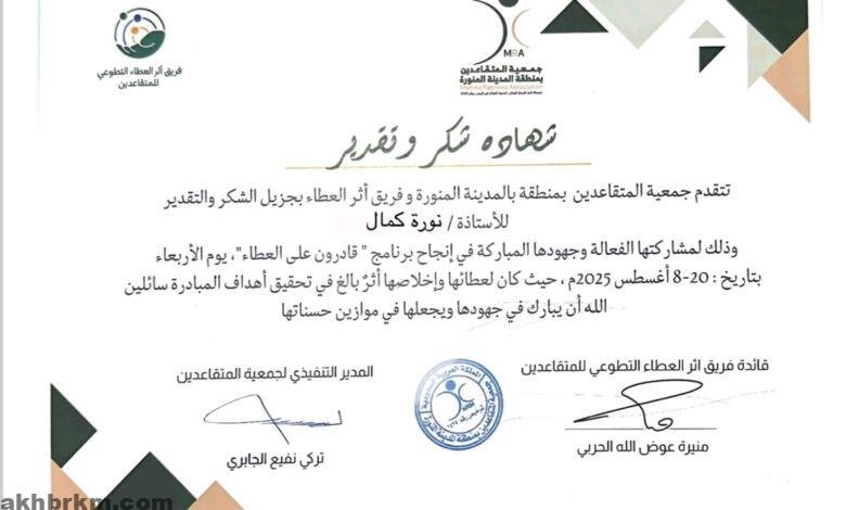 كرّمت جمعية المتقاعدين بالمدينة المنورة وفريق إثراء العطاء الإعلامية نوره كمال، وذلك خلال حفل أقيم بحضور المدير التنفيذي الأستاذ تركي نفيع الجابري، تقديرًا لمساهمتها في إنجاح برنامج “قادرون على العطاء”.