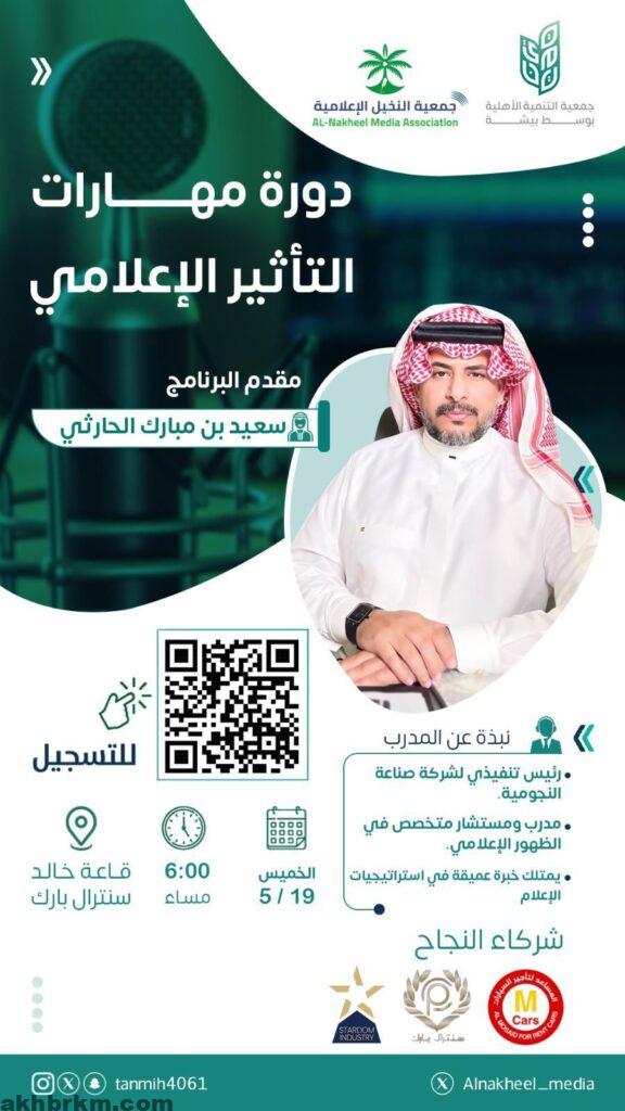 وقد أقيمت بالتعاون بين جمعية التنمية الأهلية بوسط بيشة وجمعية النخيل الاعلامية وقد تحدث المدرب عن الاعلام وأساليب تاثيره في المجتمع وكذلك أنواع الجمهور المتلقي وأسس وطرق الموثرين في المجتمع .