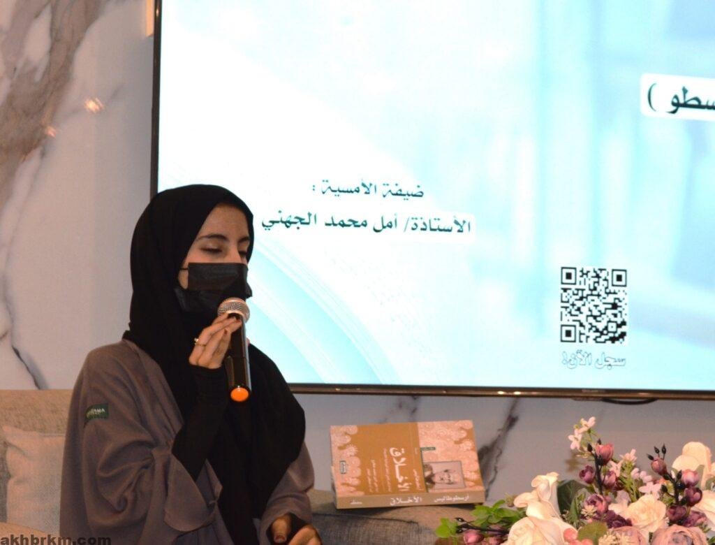 أقيمت مساء يوم الاربعاء أمسية للأستاذة أمل الجهني بعنوان الاخلاق للكاتب أرسطو. حيث تطرقت الاستاذة عن معنى الاخلاق لغة مجمع التكثير من خلق اي حال للنفس راسخة تصدر عنها الأفعال من خير شر ومن غير حاجة إلى فكر يأخذ به الانسان نفسه من الادب يسمى خلقا.