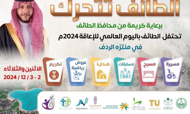 برعاية محافظ الطائف تطلق جمعية الطائف الخيرية لذوي الاحتياجات الخاصة يوم غدٍ الاثنين فعالية اليوم العالمي للإعاقة تحت شعار ” التمكين من اجل مستقبل شامل ومستدام ” بمنتزه الردف من خلال مبادرة الطائف تتحرك .