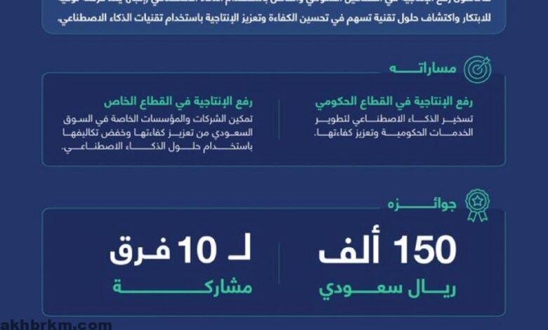 ويشتمل الهاكاثون على مسارين رئيسيين هما: الذكاء الاصطناعي لتحسين إنتاجية القطاع الحكومي، والذكاء الاصطناعي لتحسين إنتاجية القطاع الخاص، فيما ستنال الفرق العشرة الفائزة في الهاكاثون جوائز مالية تصل إلى مليون ونص مليون ريال بواقع 150 ألف ريال لكل فائز.