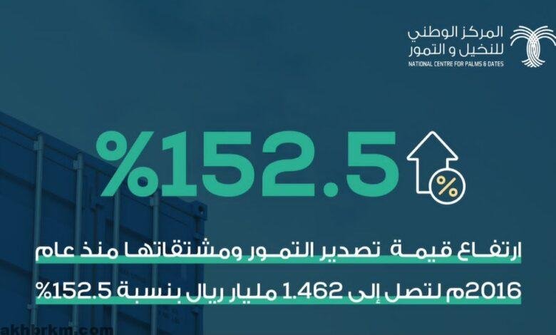 فيما حققت صادرات التمور ومشتقاتها ارتفاعاً بنسبة 152.5% منذ عام 2016 لتصل إلى 1.462 مليار ريال بنهاية العام 2023م، مقارنة بقيمة 579 مليون ريال خلال العام 2016م، وبمعدل نمو تراكمي سنوي بلغ 12.3%.