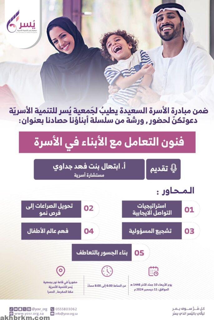 جمعية يسر للتنمية الأسرية بمكة المكرمة تقيم مساء غدا ورشة عمل بعنوان (فنون التعامل مع الأبناء في الأسرة )