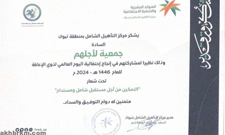 جمعية “لأجلهم” تتلقى شهادة شكر من مركز التأهيل الشامل بتبوك