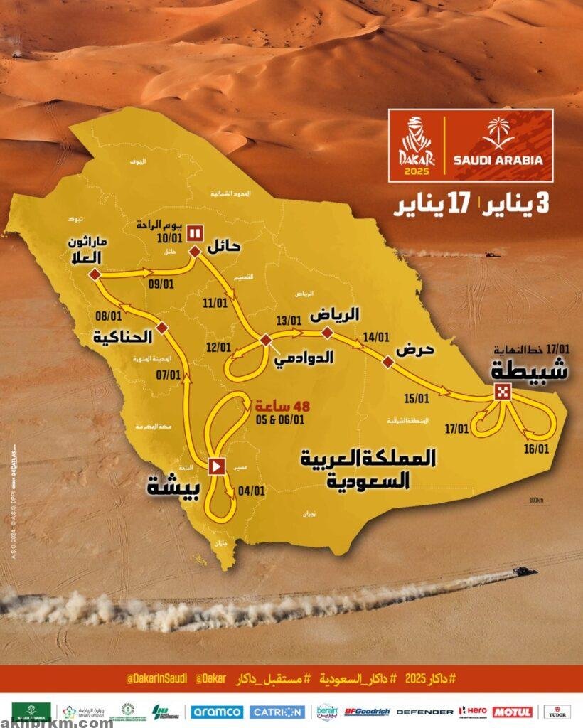 وتُقام منافسات رالي داكار السعودية في الفترة من 3 وحتى 17 يناير 2025، بمسافةٍ تبلغ 7707 كلم، بدءًا من محافظة بيشة جنوب المملكة، مرورًا بالشمال، واتصالاً بمدينة حائل، والإكمال إلى وسط المملكة في الدوادمي والرياض، فيما سيكون الختام في شبيطة، وتحديدًا في صحراء الربع الخالي، والتي تعد أكبر صحراء رملية متصلة في العالم.