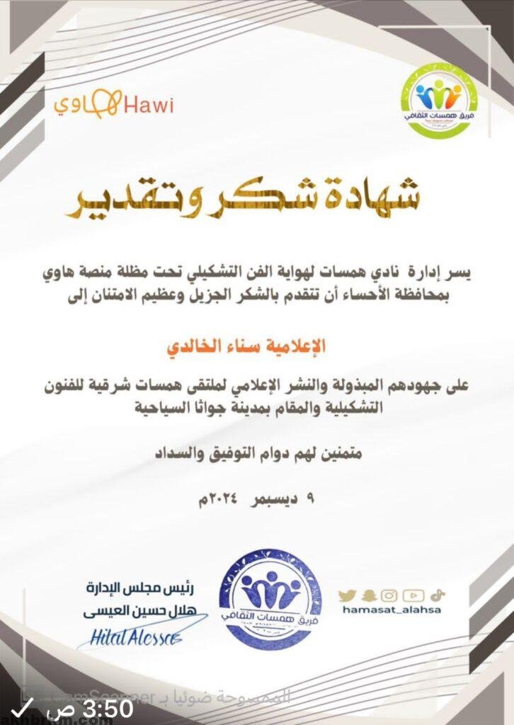 كرَّم نادي همسات للفن التشكيلي بمحافظة الأحساء الإعلامية سناء الخالدي، وذلك تقديرًا لمشاركتها الفعالة وتغطيتها الإعلامية المميزة لفعاليات ملتقى همسات للفنون التشكيلية، الذي أُقيم في مدينة جواثا السياحية بتاريخ 9 ديسمبر 2024م.