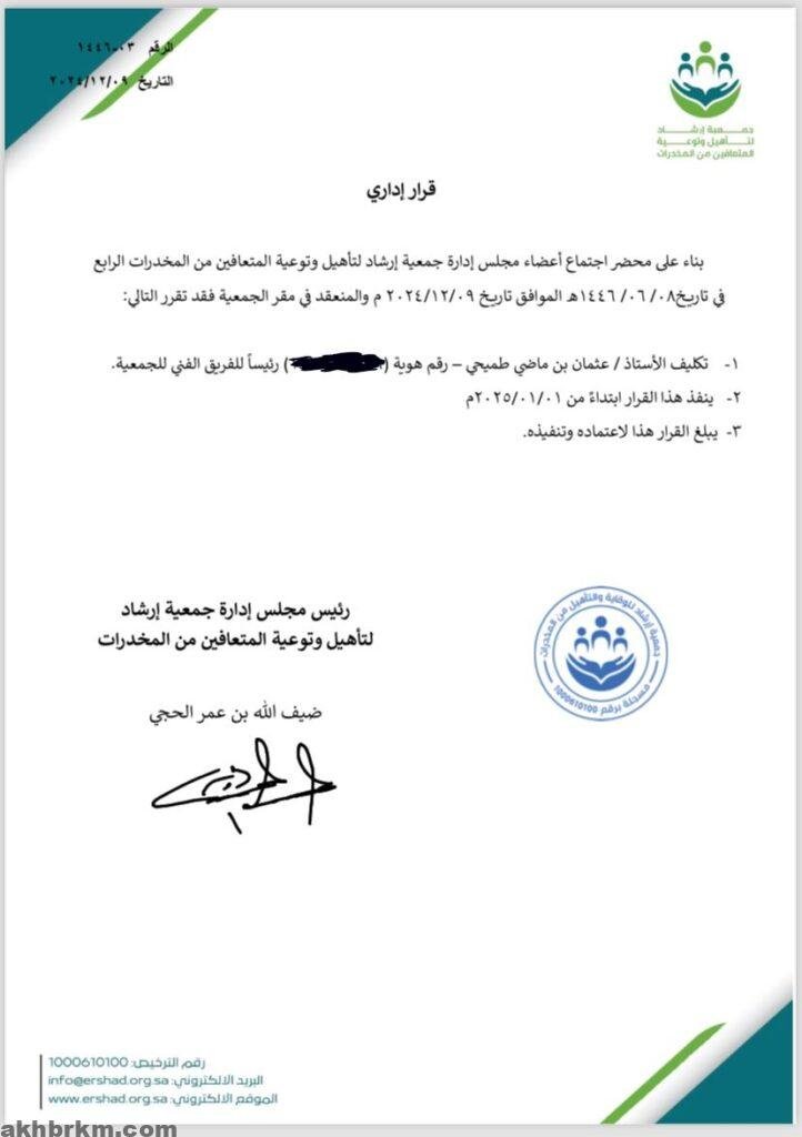 قامت جمعية إرشاد لتأهيل وتوعية المتعافين من المخدرات بتكليف الأستاذ عثمان بن ماضي طميحي رئيسا للفريق الفني بالجمعية بعد موافقة مجلس إدارتها في الاجتماع المنعقد بتاريخ 1446/6/8ويبدأتنفيذ قرار تكليفه من 2025/1/1 وعثمان طميحي من أبناء جازان وعمل في عدة مواقع تخدم مجال المتعافين من المخدرات