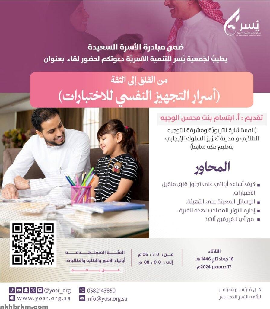 جمعية يسر للتنمية الأسرية بمكة تنظم مساء يوم غد الثلاثاء لقاء بعنوان (من القلق إلى الثقة أسرار التجهيز النفسي للاختبارات