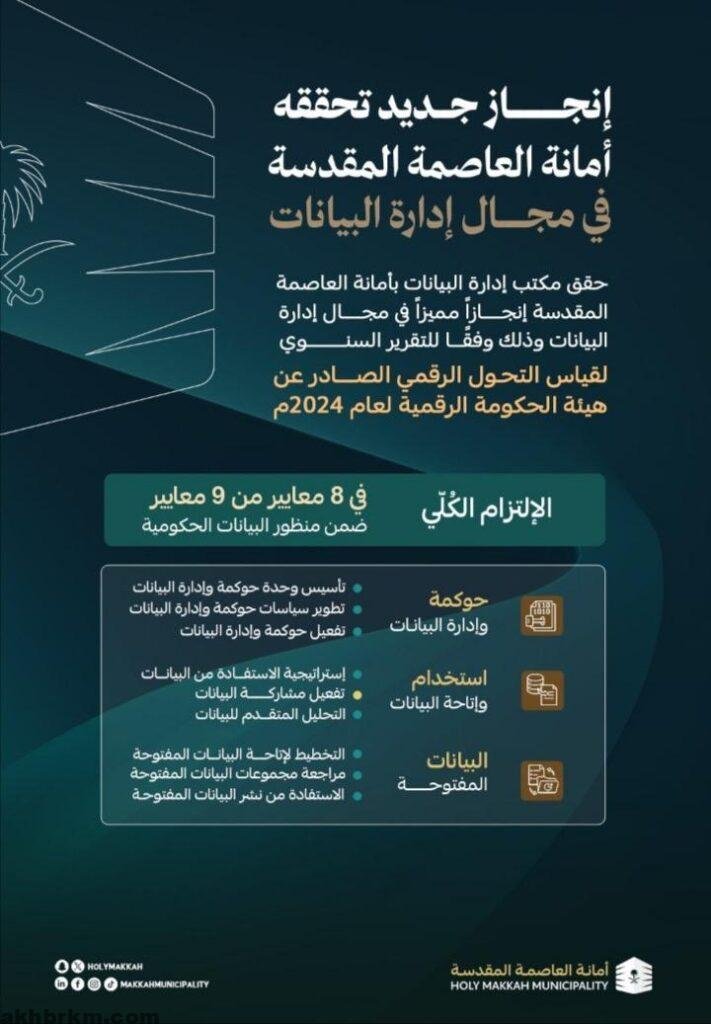 أمانة العاصمة المقدسة تحقق إنجازاً مميزاً في إدارة البيانات وفقاً لتقرير هيئة الحكومة الرقمية 2024″