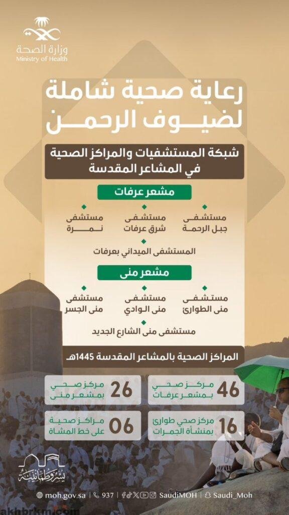 وأكدت التزام المنظومة الصحية في المملكة بتوفير أعلى مستويات الرعاية الصحية لضيوف الرحمن، من خلال كوادرها الطبية والإدارية والمنشآت والمراكز الصحية الموزعة في مكة المكرمة والمدينة المنورة والمشاعر المقدسة، لضمان سلامتهم وراحتهم خلال موسم الحج.