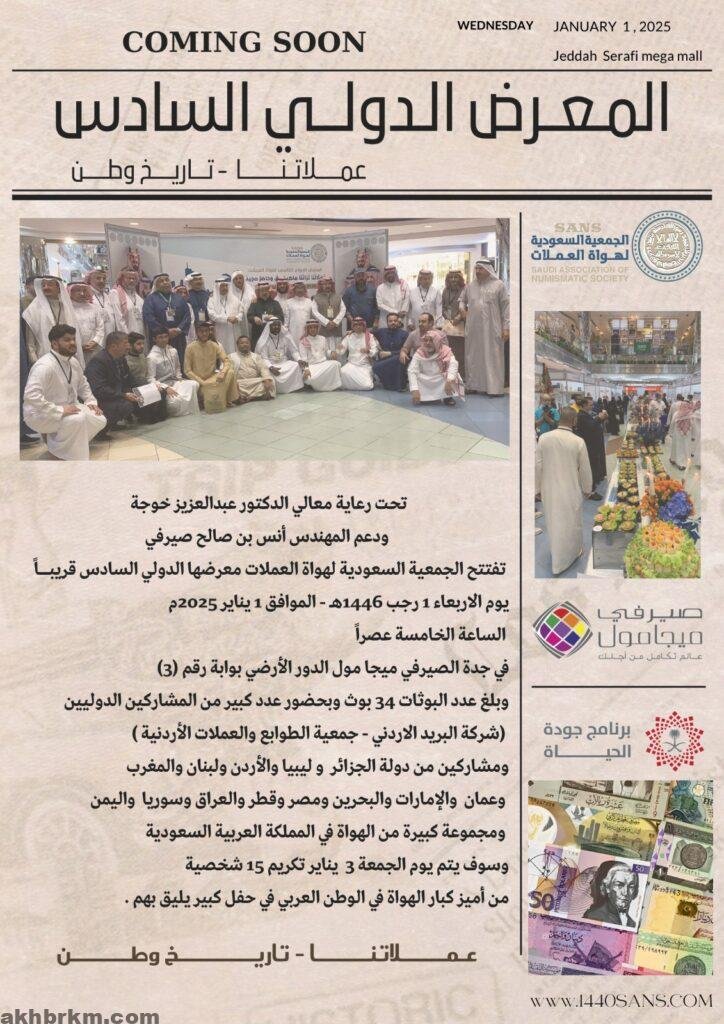 تحت رعاية معالي الدكتور عبدالعزيز خوجة، وزير الإعلام السابق، وبدعم من المهندس أنس بن صالح صيرفي، تُطلق الجمعية السعودية لهواة العملات معرضها الدولي السادس يوم الأربعاء 1 رجب 1446 هـ، الموافق 1 يناير 2025، في تمام الساعة الخامسة مساءً، في الصيرفي ميجا مول بجدة، الطابق الأرضي.