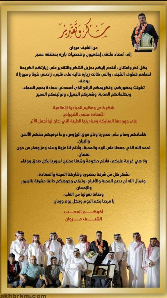في مبادرة وفاء وتقدير ..أبناء عسير يحتفون بالشيف مروان ويكرمونه بدرع تذكاري