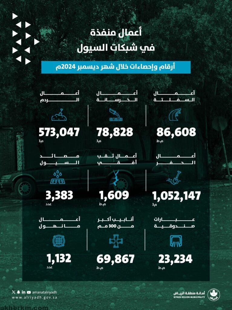 نفذت أمانة منطقة الرياض مجموعة واسعة من الأعمال الميدانية لشبكات السيول خلال شهر ديسمبر ٢٠٢٤، بهدف تعزيز كفاءة البنية التحتية ومواجهة التحديات الموسمية المرتبطة بالأمطار والسيول.