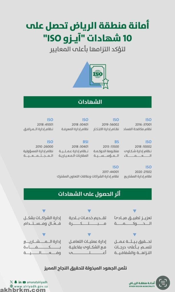 أمانة منطقة الرياض تحقق إنجازًا نوعيًا بحصولها على عشر شهادات آيزو دولية في مختلف المجالات