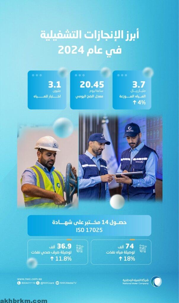 المياه الوطنية توزع وتعالج أكثر من 5.8 مليار م3 من المياه في عام 2024 وتُنفّذ نحو 111 ألف توصيلة منزلية.
