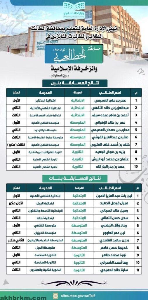 تعليم الطائف يعلن أسماء الطلبة الفائزين والفائزات في مسابقة الخط العربي