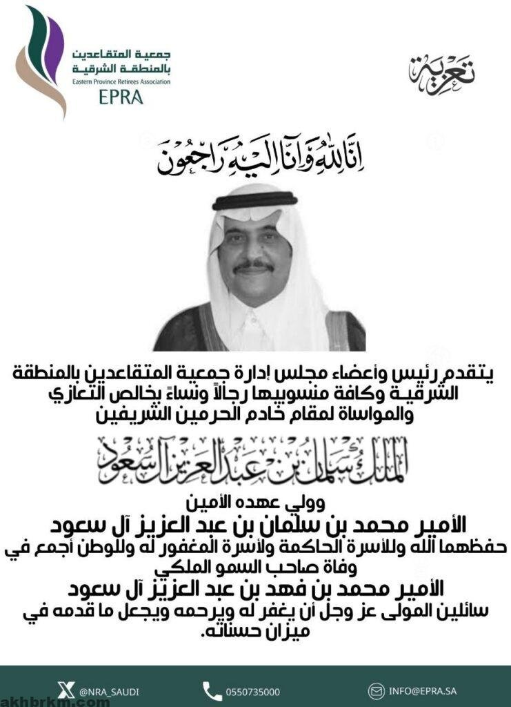 رئيس وأعضاء جمعية المتقاعدين بالشرقية يقدمون التعازي والمواساة في وفاة صاحب السمو الملكي الأمير محمد بن فهد بن عبد العزيز آل سعود