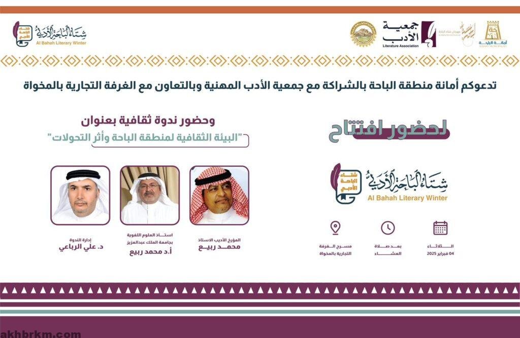 تستعد أمانة منطقة الباحة لإطلاق برنامج “شتاء الباحة الأدبي” يوم الثلاثاء المقبل، 4 فبراير 2025، الذي تنظمه أمانة منطقة الباحة بالشراكة مع جمعية الأدب المهنية وبالتعاون مع الغرفة التجارية بالمخواة. وذلك ضمن فعاليات مهرجان شتاء الباحة 2025