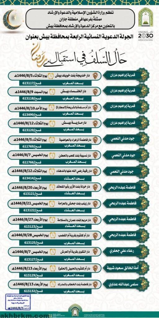 هذا وتقام محاضرة نسائية أخرى من تنفيد إدارة المساجد بمحافظة بيش وبالشراكة مع مركز الدعوة تتحدث خلالها الداعية عن حال السلف في استقبال شهر رمضان وذلك في دار حديثة بنت خويلد بالمحافظة .