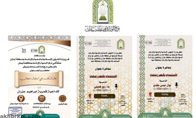 ينفذ فرع وزارة الشؤون الإسلامية والدعوة والإرشاد في منطقة جازان ممثلة بإدارة مساجد صبيا مساء اليوم الثلاثاء الخامس من شهر شعبان ١٤٤٦ هجرية المحاضرة الدعوية النسائية والتي تتحدث فيه الداعية عن كيفية الاستعداد لشهر رمضان المبارك وذلك في دار أم سليم بقرية الفرشة ، فيما تقام أخرى في دار الخنساء بقرية العشة .