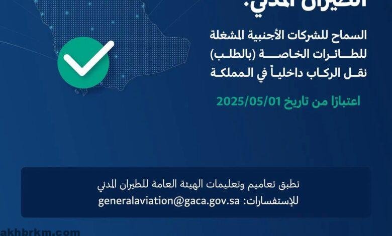 وبناءً على هذا تمنح الهيئة العامة للطيران المدني، التصريح لشركات الطيران الخاص الأجنبية (بالطلب) لنقل الركاب عبر الرحلات غير المجدولة داخليًا بعد استيفاء مقدم الطلب للمتطلبات التي تحددها الهيئة، وذلك ابتداءً من تاريخ 1 / 5 / 2025م.