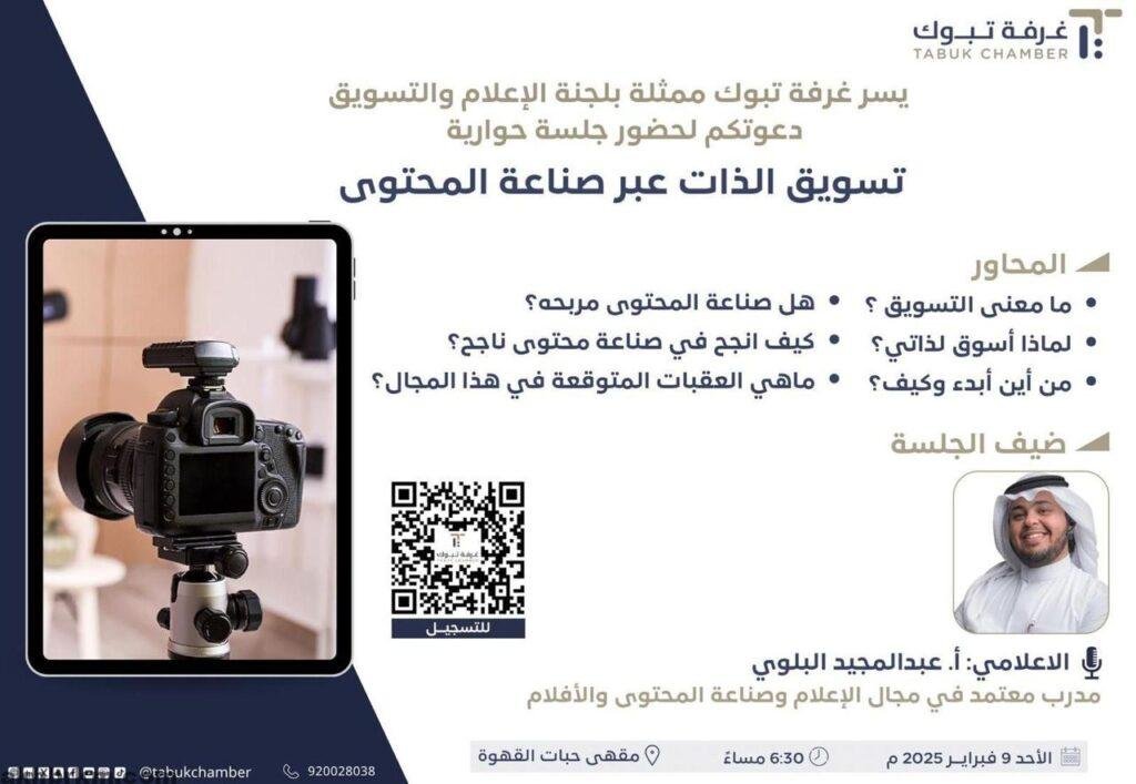 غرفة تبوك تنظّم جلسة حوارية حول “تسويق الذات عبر صناعة المحتوى”