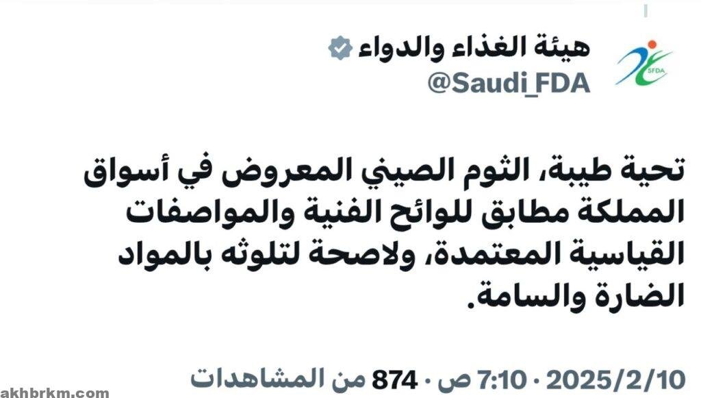 إشارة إلى المقطع المتداول عبر وسائل التواصل الاجتماعي حول مزاعم ضرر الثوم الصيني ، أكدت الهيئة العامة للغذاء والدواء، عبر حسابها الرسمي على منصة X، أن الثوم الصيني المتوفر في أسواق المملكة مطابق للوائح الفنية والمواصفات القياسية المعتمدة، ولا صحة لما يُتداول حول تلوثه بالمواد الضارة أو السامة.