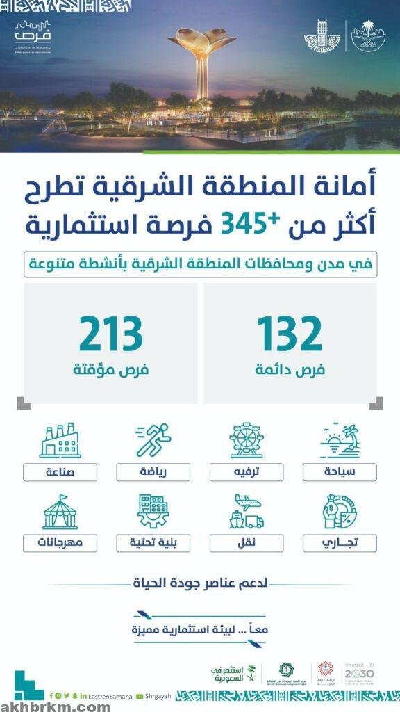 طرحت أمانة المنطقة الشرقية 345 فرصة استثمارية دائمة ومؤقتة في مختلف مدن ومحافظات المنطقة، ضمن نماذج استثمارية متنوعة تهدف إلى تطوير منظومة الاستثمار البلدي وتشجيع مشاركة القطاع الخاص في التنمية المحلية، بعض هذه الفرص تتطلب تقديم عروض فنية وخبرات تأهيلية لضمان جودة المشاريع ونوعية الخدمات، إضافة إلى قدرة وكفاءة المستثمرين على الإنجاز.