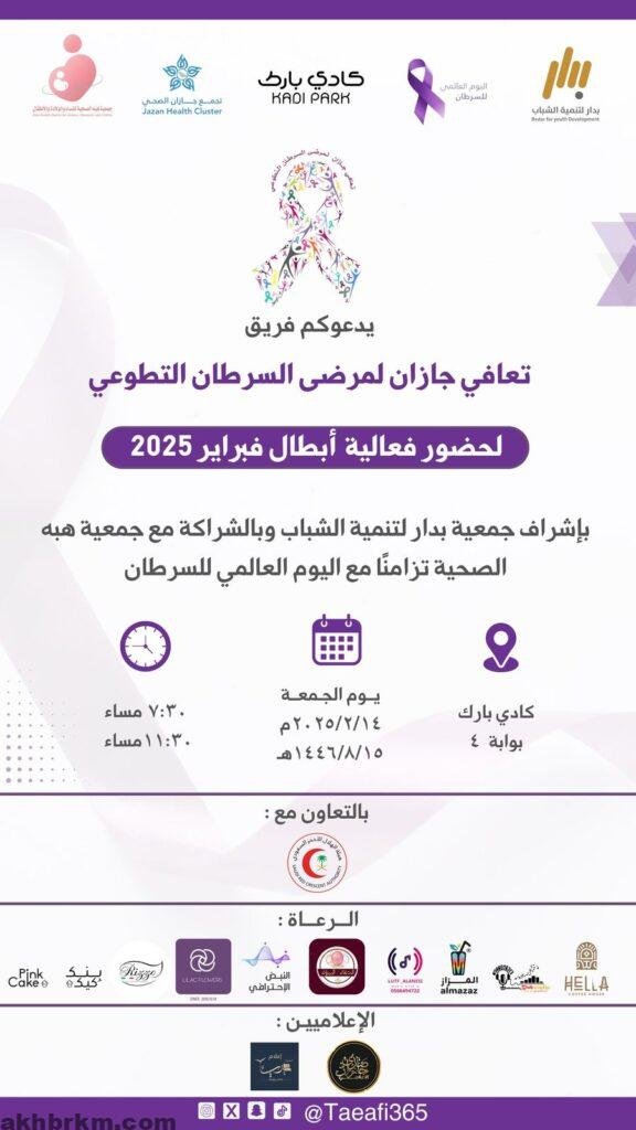 تزامناً مع اليوم العالمي للسرطان، يشهد مجمع كادي بارك بوابة ٤ بمدينة جيزان يوم الجمعة ١٤ فبراير ٢٠٢٥ م فعالية مميزة تحت عنوان “أبطال فبراير 2025″، بتنظيم من “تعافي جازان لمرضى السرطان التطوعي” وبإشراف من جمعية بدار لتنمية الشباب، وبالشراكة مع جمعية هبة الصحية و تجمع جازان الصحي بالمنطقة.
