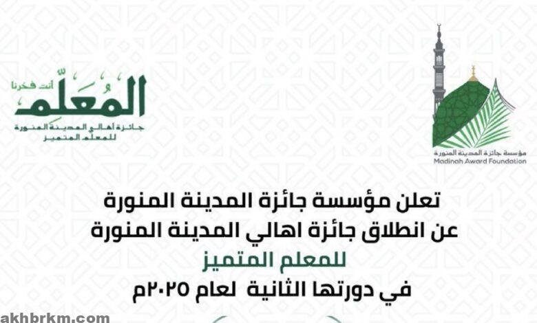 أعلنت مؤسسة جائزة المدينة المنورة عن فتح باب التقديم للدورة الثانية من جائزة أهالي المدينة المنورة للمعلم المتميز لعام 2025م، والتي تستهدف تكريم الكفاءات التعليمية المتميزة في مختلف المراحل الدراسية، تعزيزًا لدور المعلم في بناء الإنسان وتنمية المجتمع.