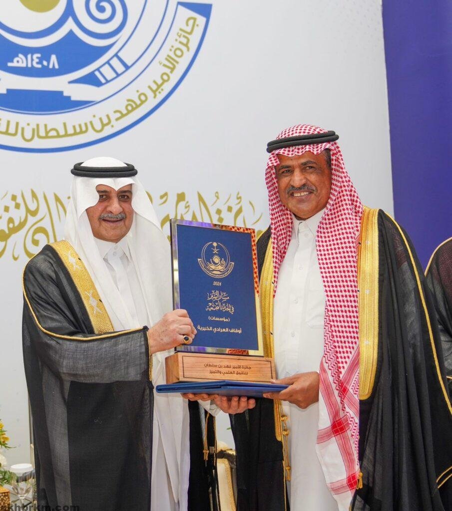 كما كرم سموه في مجال التميز بالخدمة المجتمعية ( منشآت )، أوقاف العرادي الخيرية ، نظير مساهمتهم المجتمعية المتميزة في مدينة تبوك ومحافظاتها والموجهة لتنمية المجتمع والخدمة المجتمعية والقطاع غير الربحي،