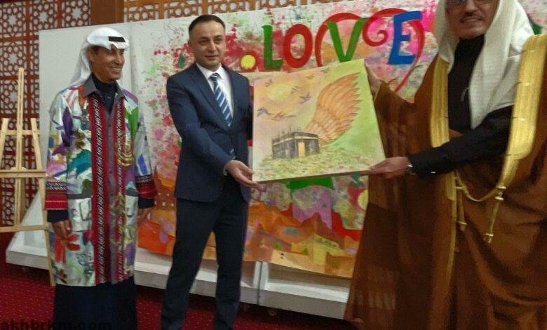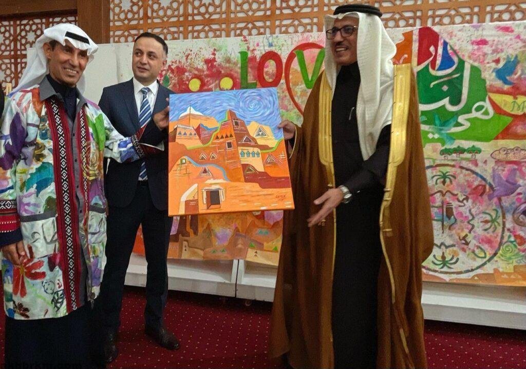 وقد شارك الفنان التشكيلي السعودي عبدالعظيم الضامن بمجموعة من الأعمال الفنية خصها لهذه المناسبة ، حيث بدأ بلوحة حب المطرزة بفسيفساء الوان تراث المملكة ولوحة المملكة تتوسطها الدرعية بمبانيها الجميلة ومباني عسير بزخارفها وقوارب الشرقية ، إضافة للوحة المحبة والسلام ، التي كانت محطة مهمة لتفاعل الجمهور برسم أجزاء منها ، حيث بدأ سعادة النائب الأول لرئيس لجنة الإستثمار وأملاك الدولة السيد يوسف زادة بالرسم مع سعادة السفير إيذاناً ببدء الرسم الرسم لجميع الحضور .