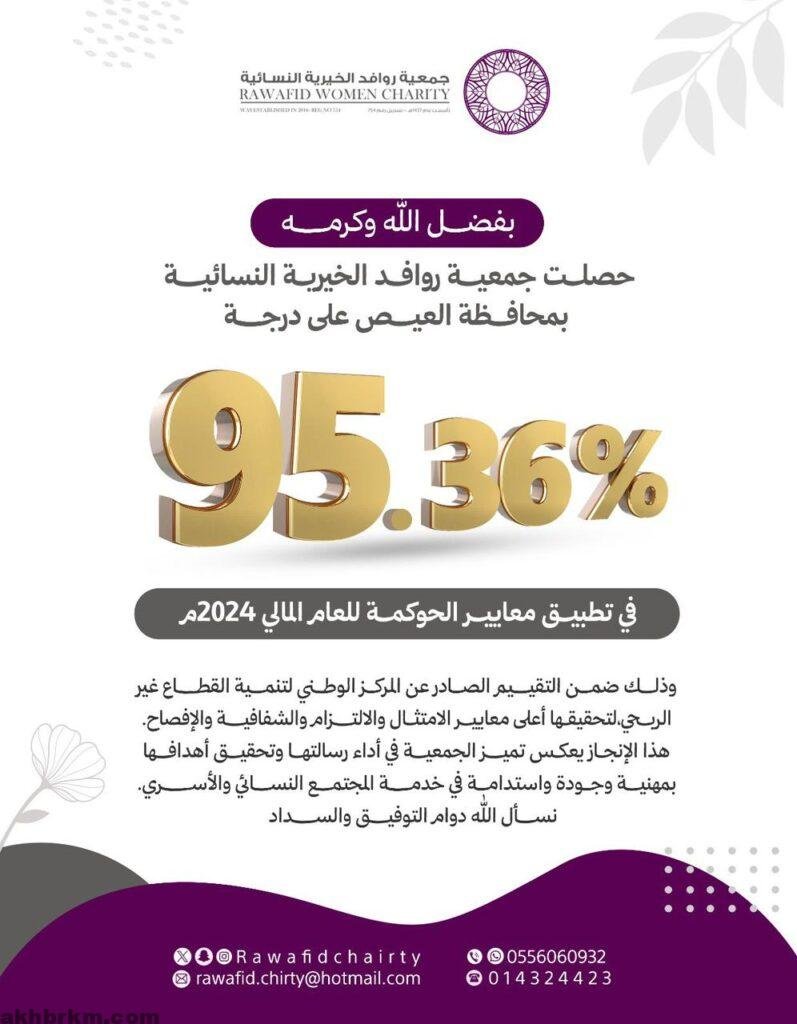 جمعية روافد النسائية بالعيص تحقق 95.36% في معايير الحوكمة لعام 2024م