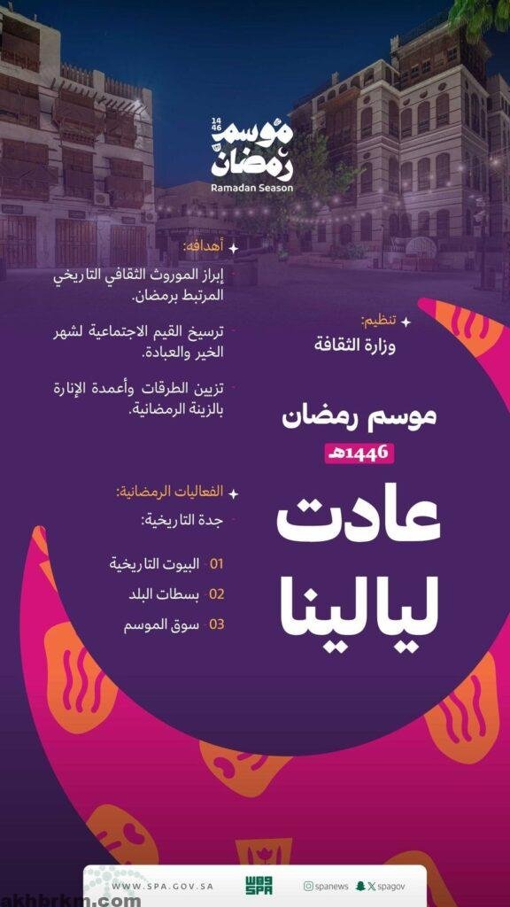 ويقدم الموسم فعاليات خاصة بالعائلات والأطفال، تشمل أنشطة ترفيهية تفاعلية تهدف إلى تعريف الأجيال الجديدة بالثقافة السعودية وتعزيز ارتباطهم بالتراث، إلى جانب جولات تاريخية في الحارات القديمة لإبراز تقاليد الشهر الكريم في بيئة تعكس الأصالة والروحانية.