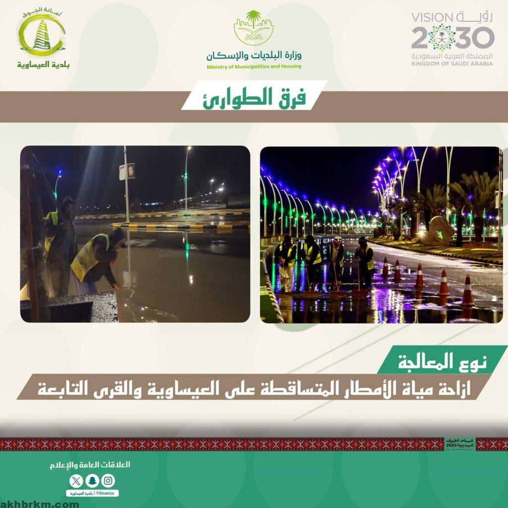 قامت بلدية مركز العيساوية التابعة لامانة منطقة الجوف بمواصلة اعمالها الميدانية بإزالة تجمعات مياه الأمطار وآثارها من المواقع غير المخدومة بشبكة تصريف مياه الأمطار من خلال عده فرق ميدانية، كما تم الانتهاء من رفع تجمعات مياه الأمطار في بعض المواقع غير المخدومة بشبكات تصريف مياه الأمطار، وجاري العمل على شفطها من المواقع الأخرى، وذلك بمتابعة ميدانية من رئيس بلدية العيساوية المهندس فارس بن حمود الجباب .