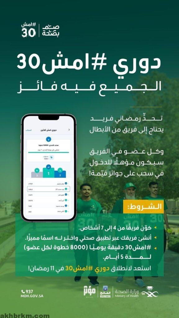 في إطار جهودها المستمرة لتعزيز الصحة العامة وتحقيق أهداف رؤية المملكة 2030، أطلقت وزارة الصحة السعودية النسخة الأولى من تحدي “دوري امش 30”، وهي مبادرة رياضية مجتمعية تهدف إلى تشجيع أفراد المجتمع على تبني نمط حياة صحي ونشط خلال شهر رمضان المبارك.