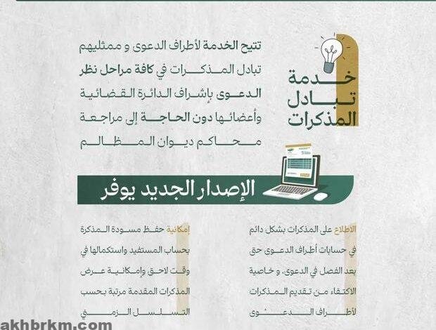 أطلق ديوان المظالم ممثلًا في مركز الخدمات القضائية الرقمية، إصداراً جديداً من خدمة تبادل المُذكرات في الخدمات القضائية عبر منصة مُعين الرقمية، والتي من خلالها يترافع أطراف الدعوى تحت إشراف الدائرة القضائية وطاقمها.