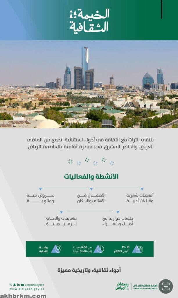 يشار إلى أن الخيمة الثقافية تُعد منصة تحتفي بتنوع المشهد الثقافي والفني في المملكة، حيث تتيح لزوارها فرصة التفاعل مع الأدب والفنون والموروث الشعبي، من خلال الأمسيات الشعرية، والعروض الفنية المتجولة، والمسابقات الثقافية، وغيرها من الأنشطة التي تعزز التواصل المجتمعي وتثري التجربة الرمضانية. كما يتم التركيز على توفير حلول مبتكرة ومستدامة في تصميم وإدارة الفعالية لضمان تحقيق استدامة الفعاليات الثقافية في العاصمة.