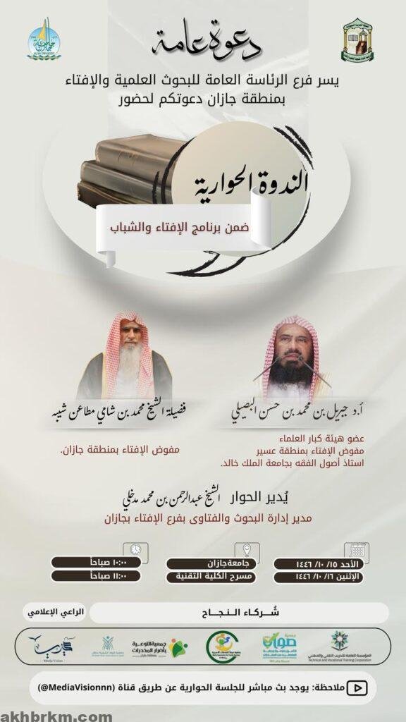 فرع الرئاسة العامة للبحوث العلمية والإفتاء بجازان يطلق ندوة حوارية ضمن برنامج “الإفتاء والشباب”